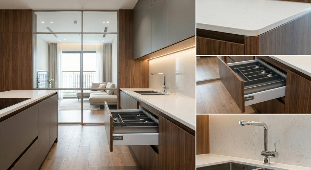 Phụ kiện thông minh: Tích hợp các giải pháp phụ kiện từ các thương hiệu uy tín (Hafele, Blum...) giúp tối ưu công năng sử dụng.