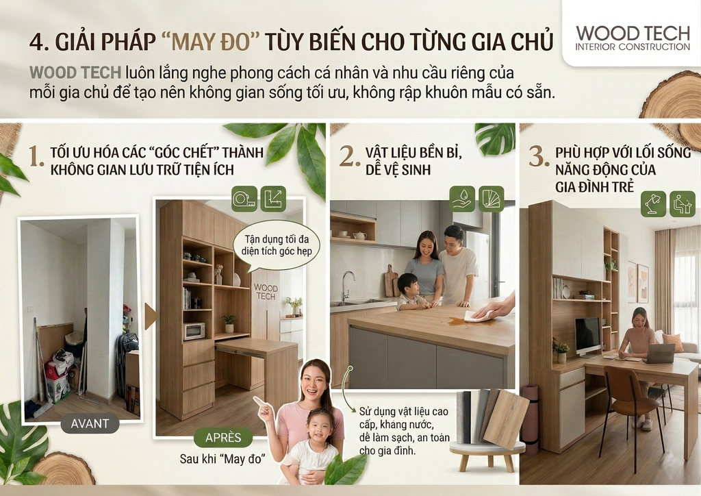 Chúng tôi hiểu rằng mỗi gia chủ đều có một phong cách cá nhân riêng. WOOD TECH không rập khuôn các mẫu có sẵn mà luôn lắng nghe để đưa ra những giải pháp tùy biến: